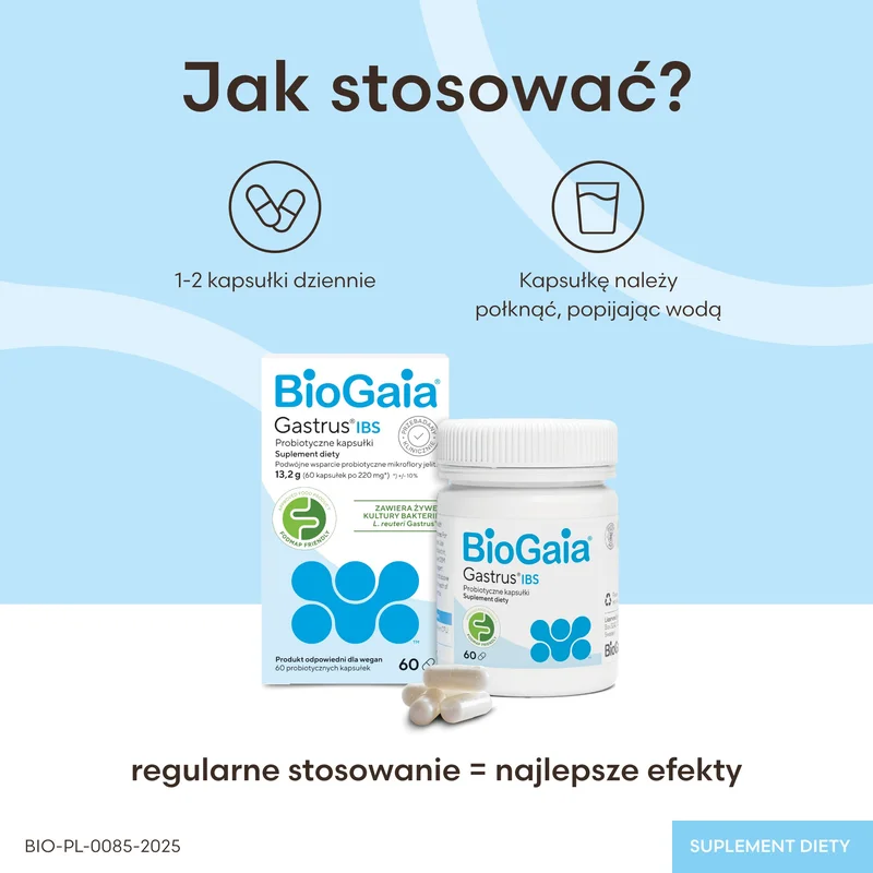 BioGaia Gastrus IBS to suplement diety w kapsułkach. Przeznaczony dla osób dorosłych, wspiera utrzymanie prawidłowej równowagi mikroflory jelitowej.