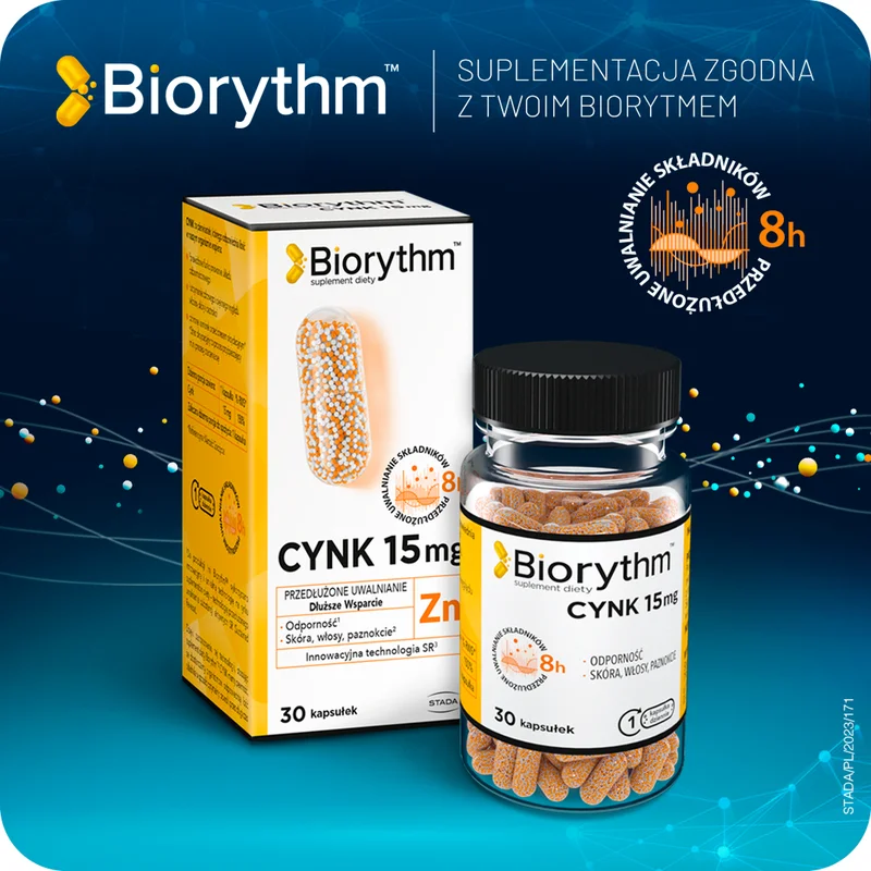 Biorythm Cynk 15 mg - suplement diety zawierający składniki o przedłużonym uwalnianiu. Produkt przeznaczony dla osób dorosłych.
