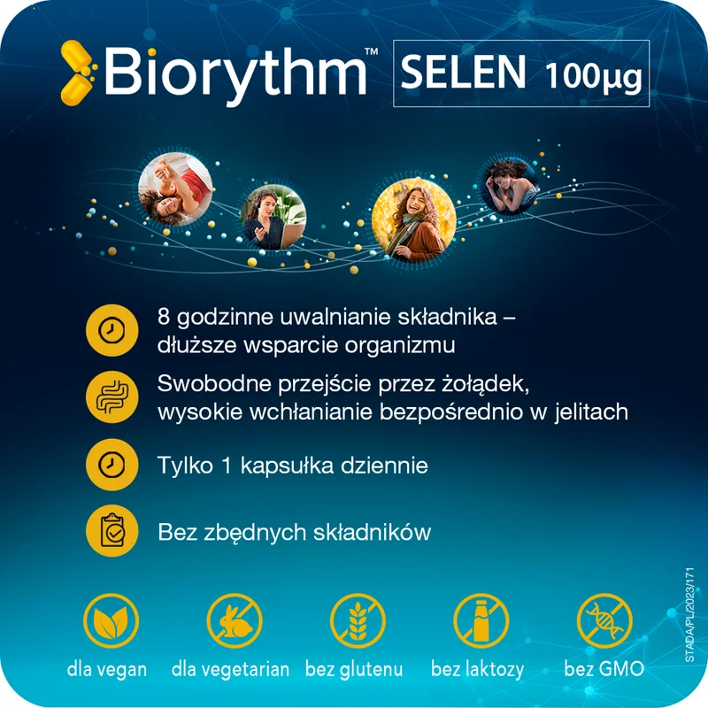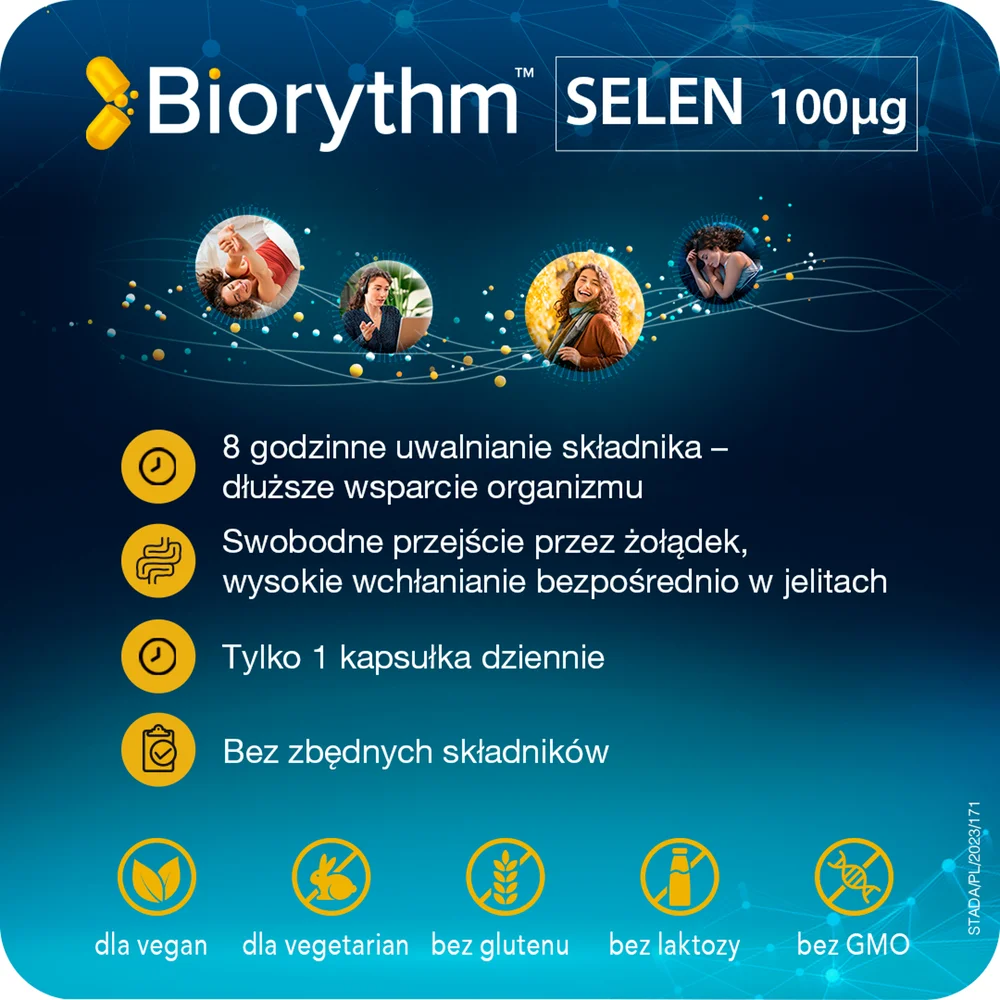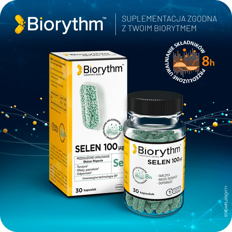 Biorythm Selen 100 µg - suplement diety zawierający składniki o przedłużonym uwalnianiu. Produkt przeznaczony dla osób dorosłych.