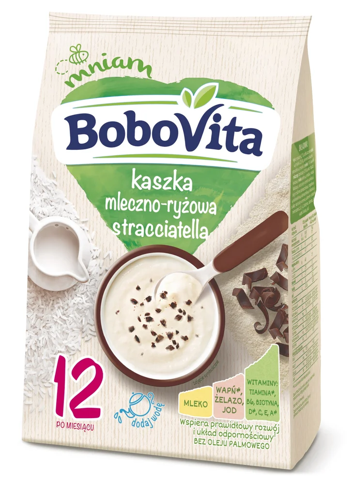 BoboVita Kaszka mleczno-ryżowa Straciatella to środek spożywczy specjalnego przeznaczenia żywieniowego, opracowany dla dzieci powyżej 1. roku życia w celu wzbogacenia codziennej diety w składniki preparatu.