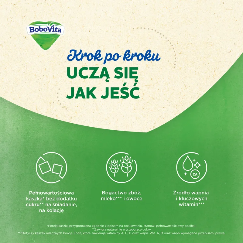 BoboVita Porcja Zbóż pomoże Twojemu dziecku odkryć i polubić różnorodność zbóż. Pyszna bezmleczna kaszka dla dzieci powyżej 8 miesiąca życia.Masa netto