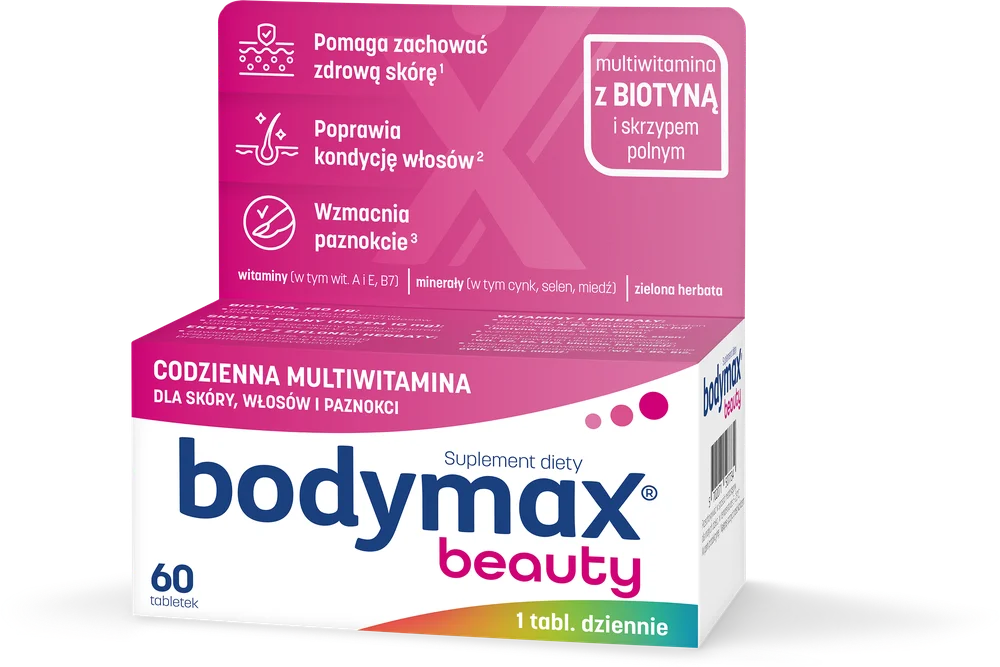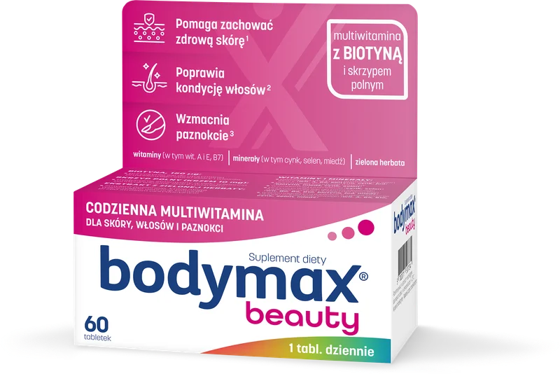 Suplement diety Bodymax Beauty to multiwitamina z dodatkiem składników roślinnych, przeznaczona do uzupełniania codziennej diety w witaminy i minerały. Preparat zawiera m.in. biotynę, cynk, selen, jod oraz witaminy z grupy B, a dodatkowo wyciąg ze skrzypu polnego i ekstrakt z zielonej herbaty będący źródłem polifenoli.