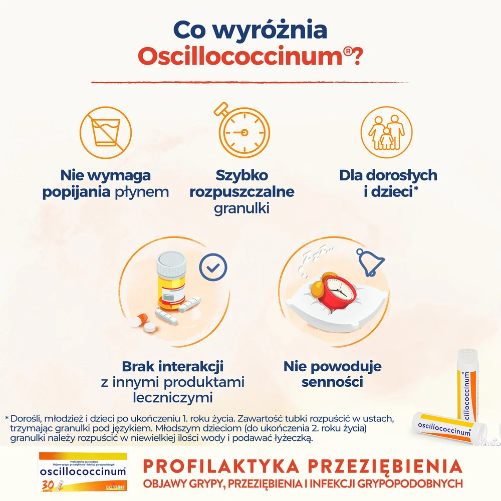 Oscillococcinum działa łagodząco na objawy grypy, przeziębienia i infekcji grypopodobnych, takie jak gorączka, osłabienie, bóle mięśni i stawów, drapanie w gardle oraz ogólne złe samopoczucie. Regularne stosowanie w okresach zwiększonej zachorowalności może wspierać profilaktykę infekcji dróg oddechowych.