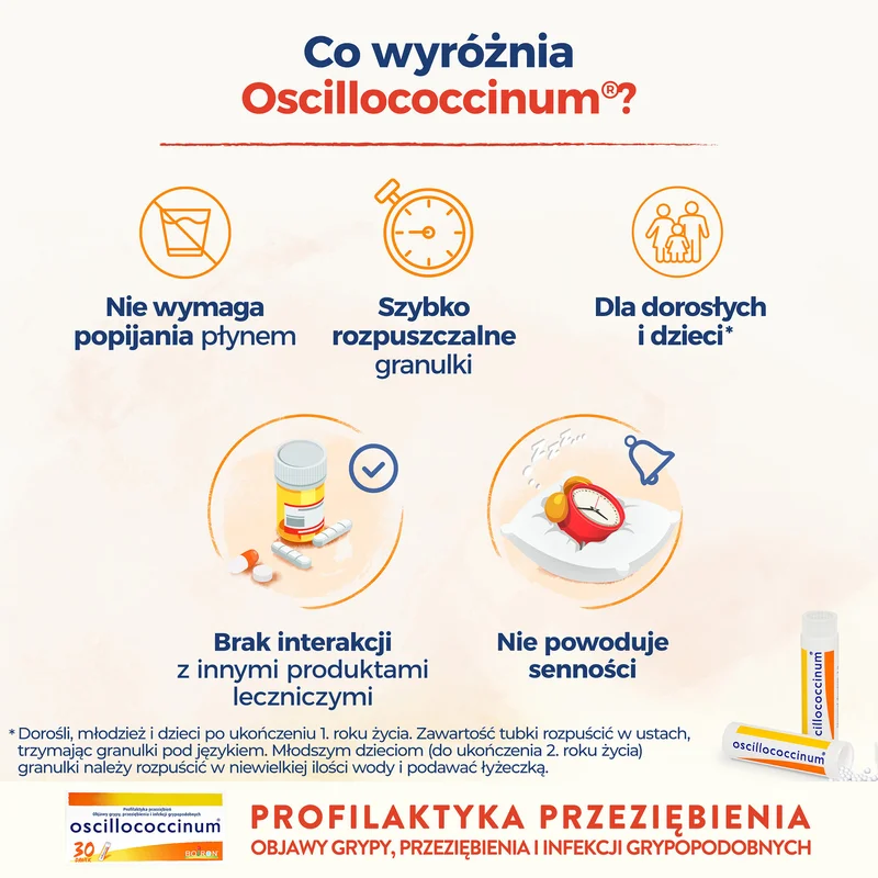 Oscillococcinum to homeopatyczny produkt leczniczy dostępny w aptekach, wskazany do łagodzenia objawów grypy, przeziębienia oraz infekcji grypopodobnych. Preparat wspomaga organizm w redukcji takich symptomów jak gorączka, dreszcze, bóle mięśni i ogólne osłabienie, szczególnie w początkowej fazie zakażenia. Produkt przeznaczony jest dla osób dorosłych oraz dzieci powyżej 1. roku życia. Granulki do stosowania podjęzykowego zapewniają łatwą i wygodną aplikację, co umożliwia bezproblemowe podanie również najmłodszym pacjentom. Preparat stosuje się zgodnie z zaleceniami dawkowania, zarówno przy pierwszych oznakach infekcji, jak i w trakcie jej rozwijania się.
