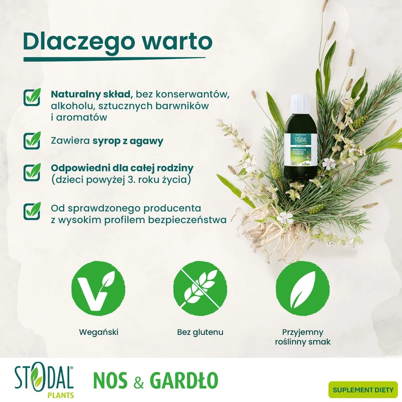 Stodal Plants to suplement diety, który zawiera składniki roślinne wspierające funkcje organizmu. Preparat wzbogacony jest o ekstrakty z ziół, które pomagają w utrzymaniu równowagi wewnętrznej. Składniki te mogą wspierać układ odpornościowy oraz funkcje oddechowe. Produkt przeznaczony jest dla osób poszukujących naturalnych rozwiązań w codziennej diecie. Syrop odpowiedni dla osób dorosłych oraz dzieci powyżej 3. roku życia.