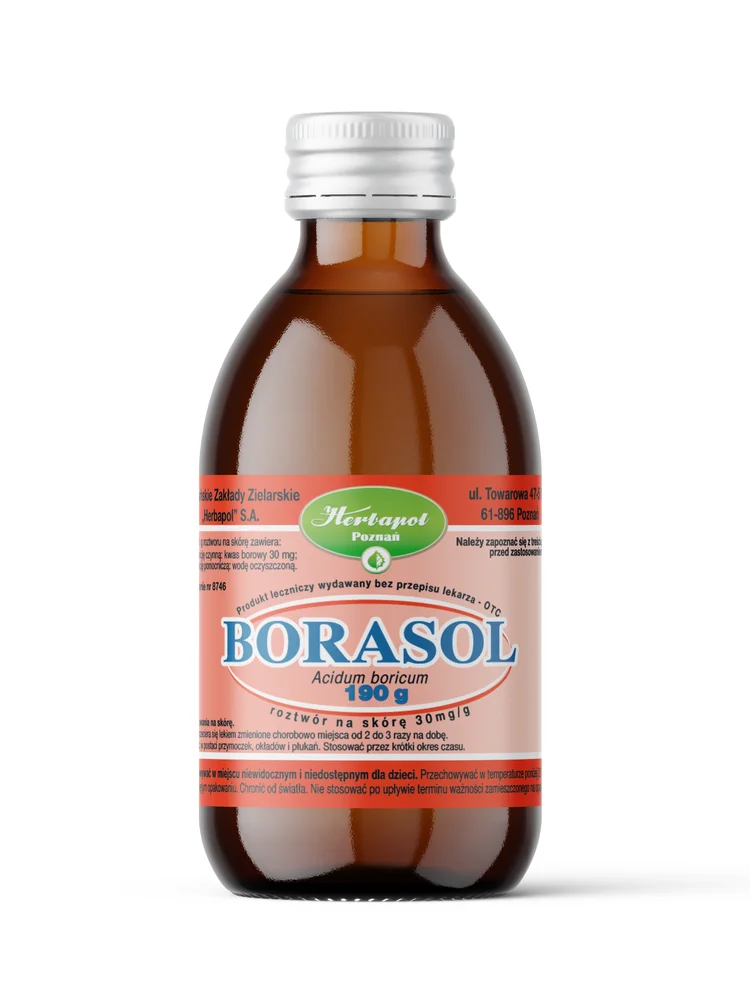 Borasol zawiera substancję czynną kwas borowy o działaniu przeciwgrzybiczym i przeciwbakteryjnym.