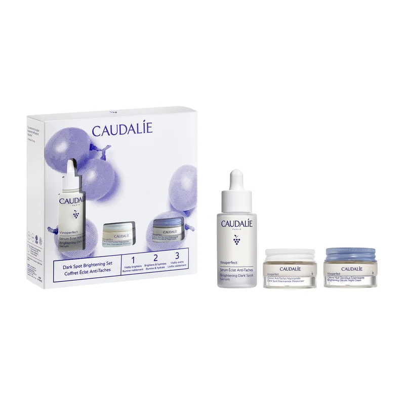 Caudalie Vinoperfect Zestaw Serum, Krem nawilżający z niacynamidem Krem na noc z kwasem glikolowym to produkty kosmetyczne do pielęgnacji skóry z przebarwieniami, nierównym kolorytem, matowym wyglądem i nierówną teksturą.Produkty wzajemnie się uzupełniają, dzięki czemu pielęgnacja obejmuje zarówno rozjaśnianie, jak i nawilżenie, wygładzenie oraz poprawę ogólnego wyglądu skóry.