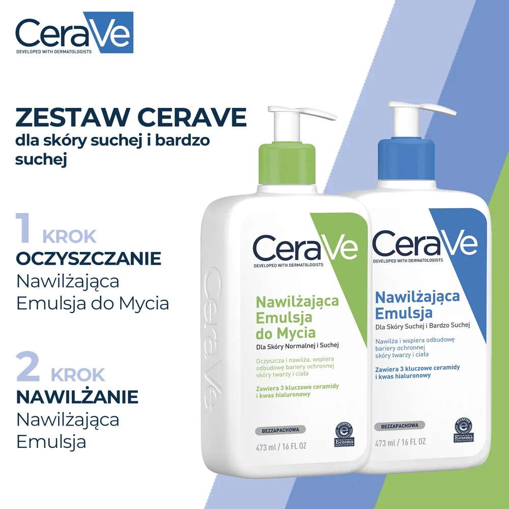 CERAVE Nawilżająca Emulsja do Mycia z ceramidami dla skóry normalnej i suchej, 473 ml + CERAVE Nawilżająca emulsja do twarzy i ciała do skóry suchej i bardzo suchej, 473 ml