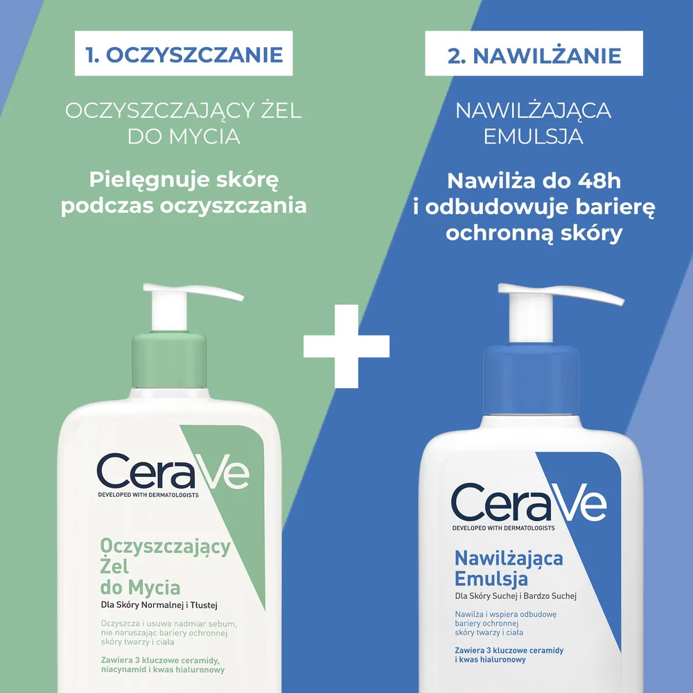 CERAVE Oczyszczający Żel do Mycia z ceramidami dla skóry normalnej i tłustej: Niewielką ilość żelu nanieść na dłonie, rozprowadzić na wilgotnej skórze, a następnie dokładnie spłukać wodą. CERAVE Nawilżająca emulsja do twarzy i ciała do skóry suchej i bardzo suchej: Aplikować na skórę twarzy i ciała. Stosować w zależności od potrzeb skóry.Informacje o bezpieczeństwie