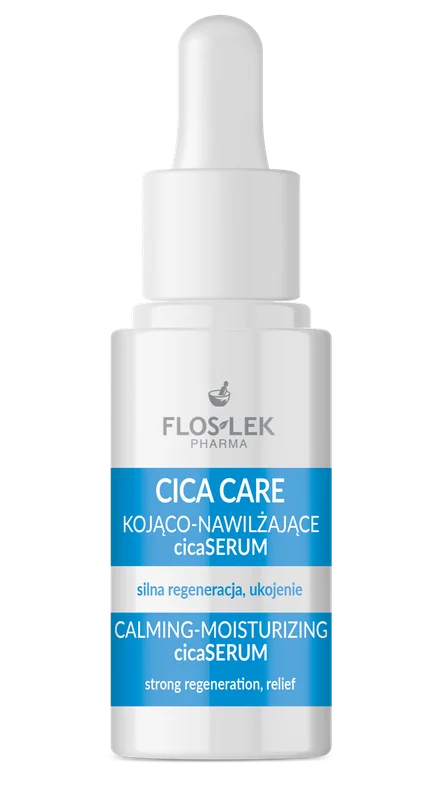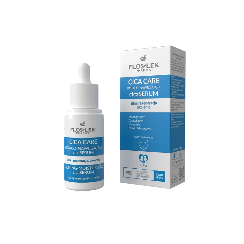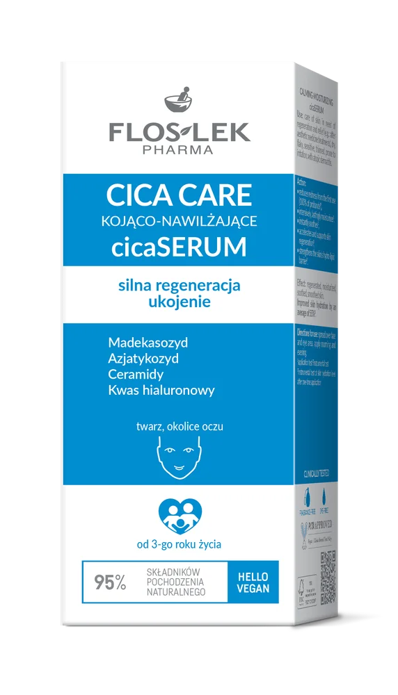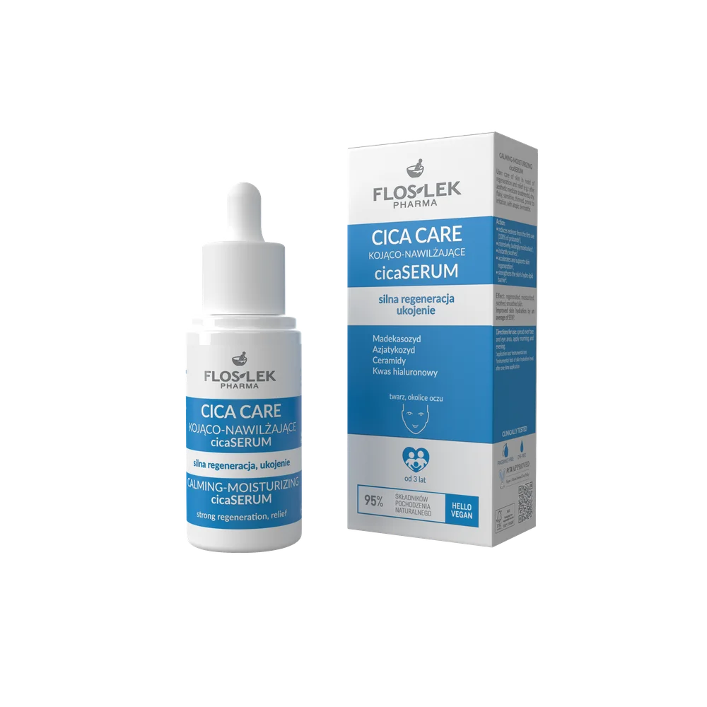 Floslek Cica Care, Kojąco-nawilżające CICAserum to produkt kosmetyczny przeznaczony do codziennej pielęgnacji skóry wymagającej regeneracji i ukojenia, w tym przesuszonej, łuszczącej się, wrażliwej, ścieńczonej, skłonnej do podrażnień oraz z AZS, a także po zabiegach medycyny estetycznej. Produkt dla osób dorosłych i dzieci od 3 lat.