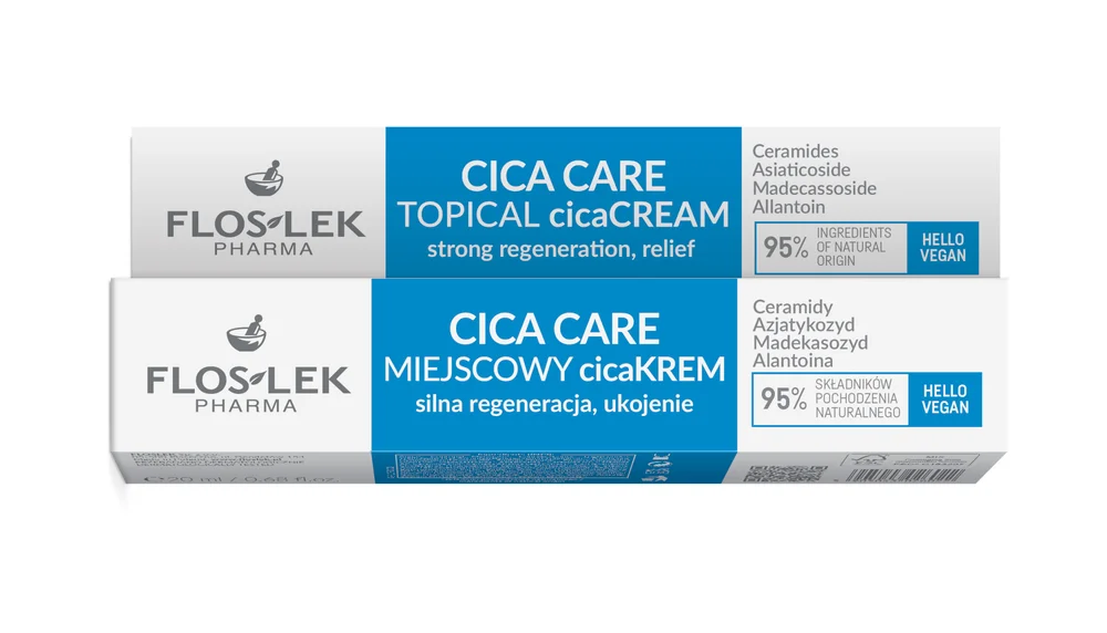 Floslek Cica Care, Miejscowy CICAkrem to produkt kosmetyczny przeznaczony do miejscowej pielęgnacji skóry wymagającej regeneracji i odbudowy naskórka. Nadaje się do stosowania na skórę po powierzchownych podrażnieniach, otarciach, przesuszoną, swędzącą, łuszczącą się, ścieńczoną, podrażnioną po goleniu oraz ze skłonnością do AZS i egzemy. Produkt dla osób dorosłych i dzieci od lat 3.