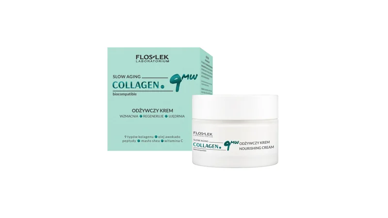 Floslek Collagen. 9MW Odżywczy krem wzmacnia, regeneruje, ujędrnia to produkt kosmetyczny przeznaczony do codziennej pielęgnacji skóry twarzy i szyi, który intensywnie nawilża, wspomaga odbudowę struktury skóry, poprawia jej elastyczność i wygładza zmarszczki.