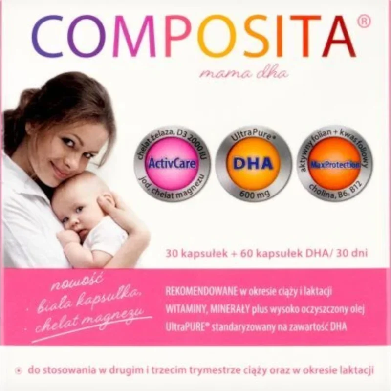 Composita Mama DHA to suplement zawierający witaminy i składniki mineralne oraz kwasy tłuszczowe EPA i DHA. Składniki pomagają uzupełnić codzienną dietę kobiet w ciąży (w drugim i trzecim trymestrze) oraz w okresie laktacji.
