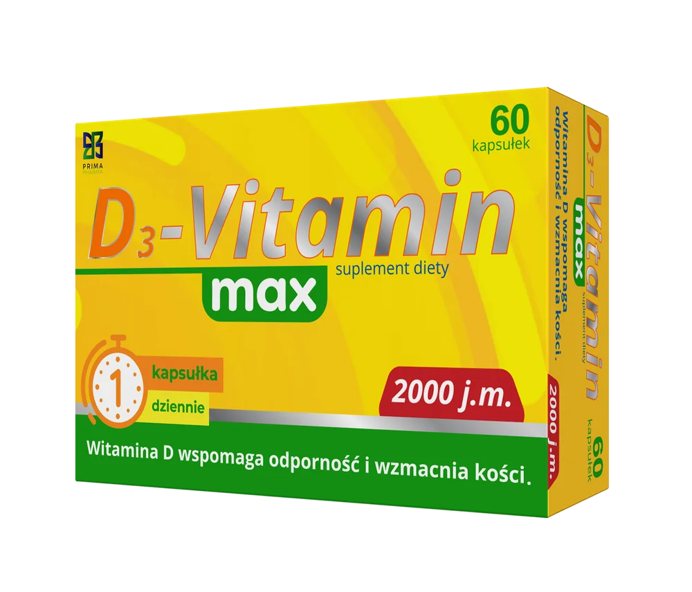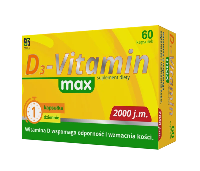 Prima Pharma D3-Vitamin Max to suplement diety w postaci kapsułek, zawierający witaminę D do codziennego uzupełniania diety. Preparat przeznaczony jest dla osób dorosłych do 75. roku życia.