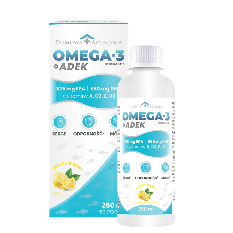 Domowa Apteczka, Omega 3 ADEK to suplement diety zawierający składniki istotne dla organizmu. Kwasy Omega-3 wspierają prawidłowe funkcje serca oraz układu krążenia, witamina A jest ważna dla prawidłowego widzenia i funkcjonowania układu odpornościowego, witamina D odgrywa rolę w procesie wchłaniania wapnia i fosforu, natomiast witamina K jest istotna dla procesów krzepnięcia krwi. Składniki suplementu przyczyniają się do utrzymania równowagi żywieniowej w diecie. Produkt odpowiedni dla osób dorosłych oraz dzieci powyżej 3. roku życia.