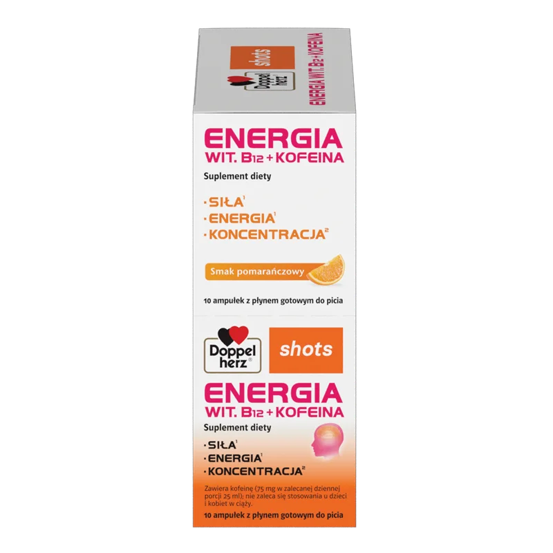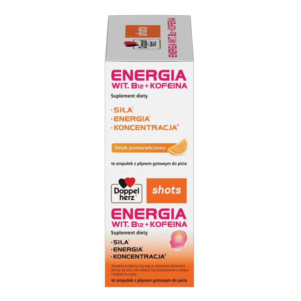 Doppelherz shots ENERGIA Wit. B12 + kofeina to suplement diety. Składniki suplementu, w tym witamina B12 i kofeina, wspierają organizm w walce z uczuciem zmęczenia oraz wspomagają funkcje energetyczne. Produkt przeznaczony jest do uzupełnienia codziennej diety w niezbędne składniki przez osoby dorosłe.