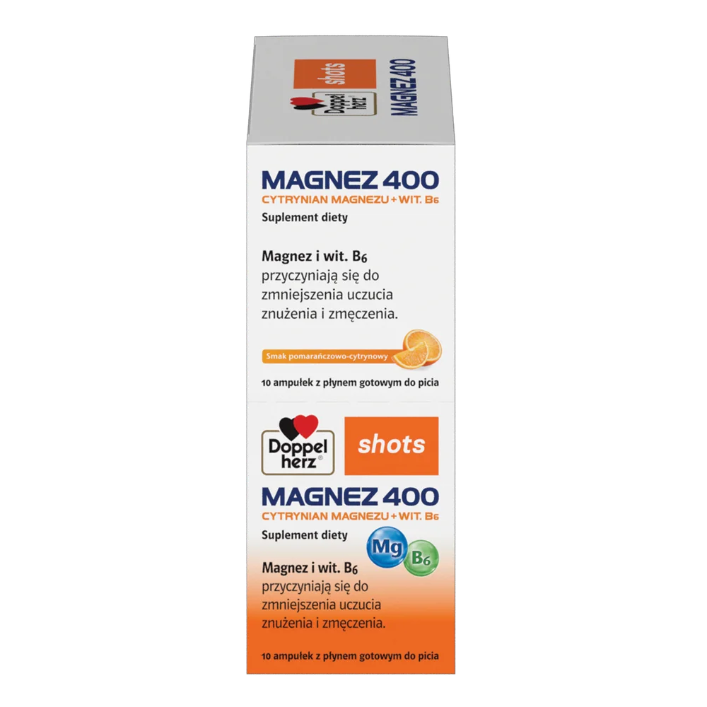 Suplement diety Doppelherz shots MAGNEZ 400 został opracowany z myślą o dorosłych, którzy potrzebują wygodnej formy uzupełnienia magnezu. Produkt dostępny jest jako gotowy do spożycia shot o smaku pomarańczowo-cytrynowym. Zawarty w nim magnez występuje w formie cytrynianu, cenionej za wysoką przyswajalność. Preparat sprawdzi się u osób aktywnych, uprawiających sport oraz żyjących w szybkim tempie lub doświadczających okresów zwiększonego napięcia.