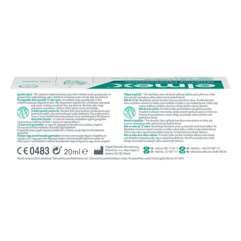 Dla uzyskania natychmiastowej ulgi pastę nakładać na powierzchnię nadwrażliwego zęba opuszką palca i delikatnie wmasowywać przez 1 minutę. U dzieci poniżej dwunastu lat nie nakładać pasty opuszką palca dla uzyskania natychmiastowej ulgi. Dla uzyskania długotrwałej ulgi, nakładać na miękką szczoteczkę do zębów i szczotkować wszystkie powierzchnie zębów, gdzie występuje nadwrażliwość. Szczotkować 2 razy dziennie. Nadwrażliwość zębów może być spowodowana przez inny problem. W przypadku przedłużającego się bólu, należy skontaktować się ze stomatologiem. U dzieci poniżej sześciu lat stosować ilość pasty wielkości ziarnka grochu pod kontrolą dorosłych, aby zminimalizować ryzyko połknięcia. Przy przyjmowaniu fluoru z innych źródeł należy skonsultować się ze stomatologiem lub lekarzem.Informacje o bezpieczeństwie