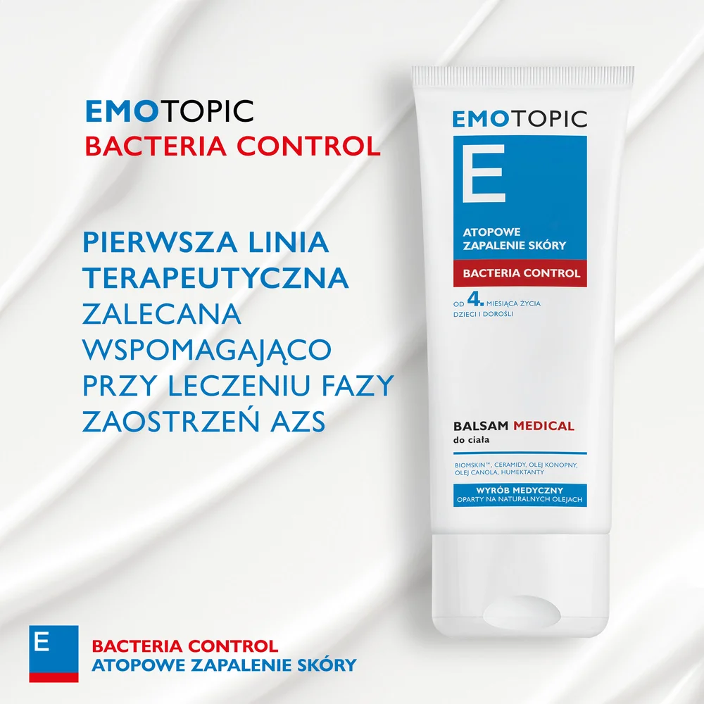 Emotopic Bacteria Control balsam Medical do ciała to wyrób medyczny, który działa łagodząco, zmniejszając nasilenie istniejących objawów chorobowych w atopowym zapaleniu skóry. Balsam łagodzi dolegliwości wynikające z nadmiernego przesuszenia, takie jak: szorstkość, łuszczenie.
