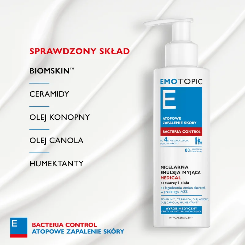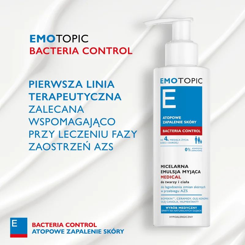 Emotopic Bacteria Control micelarna emulsja myjąca do twarzy i ciała to wyrób medyczny, który łagodzi zmiany skórne w przebiegu atopowego zapalenia skóry (AZS) poprzez delikatnie oczyszczenie skóry z zanieczyszczeń, drobnoustrojów oraz potencjalnych czynników drażniących i alergizujących. Produkt przeznaczony jest dla dorosłych i dzieci od 4. miesiąca życia.