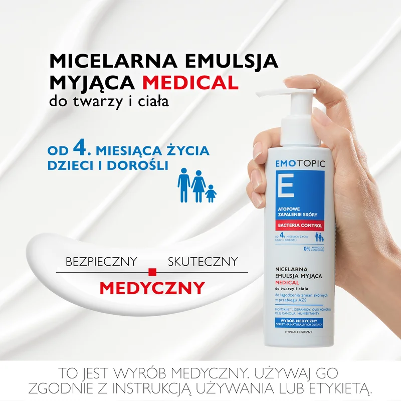 EMOTOPIC BACTERIA CONTROL MICELARNA EMULSJA MYJĄCA MEDICAL to łagodna emulsja polecana do mycia twarzy i ciała z objawami atopowego zapalenia skóry (AZS). Do stosowania również w fazie zaostrzeń związanych często z nadmierną kolonizacją przez Staphylococcus aureus i w okresach remisji. Wskazana profilaktycznie do codziennego użycia w celu zapobiegania występowaniu nasilonych objawów AZS (stany zapalne, świąd, zaczerwienienie, nadmierna suchość, łuszczenie i pieczenie). Może być stosowana długookresowo. Wyrób rekomendowany dla dorosłych i dzieci od 4. miesiąca życia.Sposób użycia wyrobu medycznego