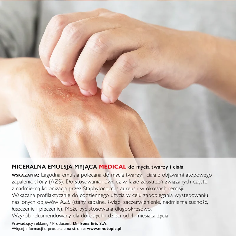 To jest wyrób medyczny. Używaj go zgodnie z instrukcją używania lub etykietą. W przypadku przedostania się emulsji do oczu, natychmiast przemyć je ciepłą wodą. Nie stosować na rany i błony śluzowe. Nie połykać. Nie stosować przed ukończeniem 3. miesiąca życia. Wyrób nie powinien być stosowany przez osoby uczulone na którykolwiek ze składników. W przypadku wystąpienia podrażnienia należy zaprzestać stosowania wyrobu. W sytuacji zaostrzenia zmian skórnych skontaktować się z lekarzem. Przechowywać w temperaturze pokojowej oraz unikać ekspozycji wyrobu bezpośrednio na wysoką temperaturę. Chronić przed światłem słonecznym. Przechowywać w miejscu niewidocznym i niedostępnym dla dzieci. Nie używać po upływie daty ważności. Nie używać w przypadku uszkodzonego opakowania.Producent: DR IRENA ERIS Sp.a. , ul. Armii Krajowej 12, 05-500 Piaseczno To jest wyrób medyczny. Używaj zgodnie z instrukcją używania lub etykietą. W razie wątpliwości skonsultuj się z lekarzem lub farmaceutą.