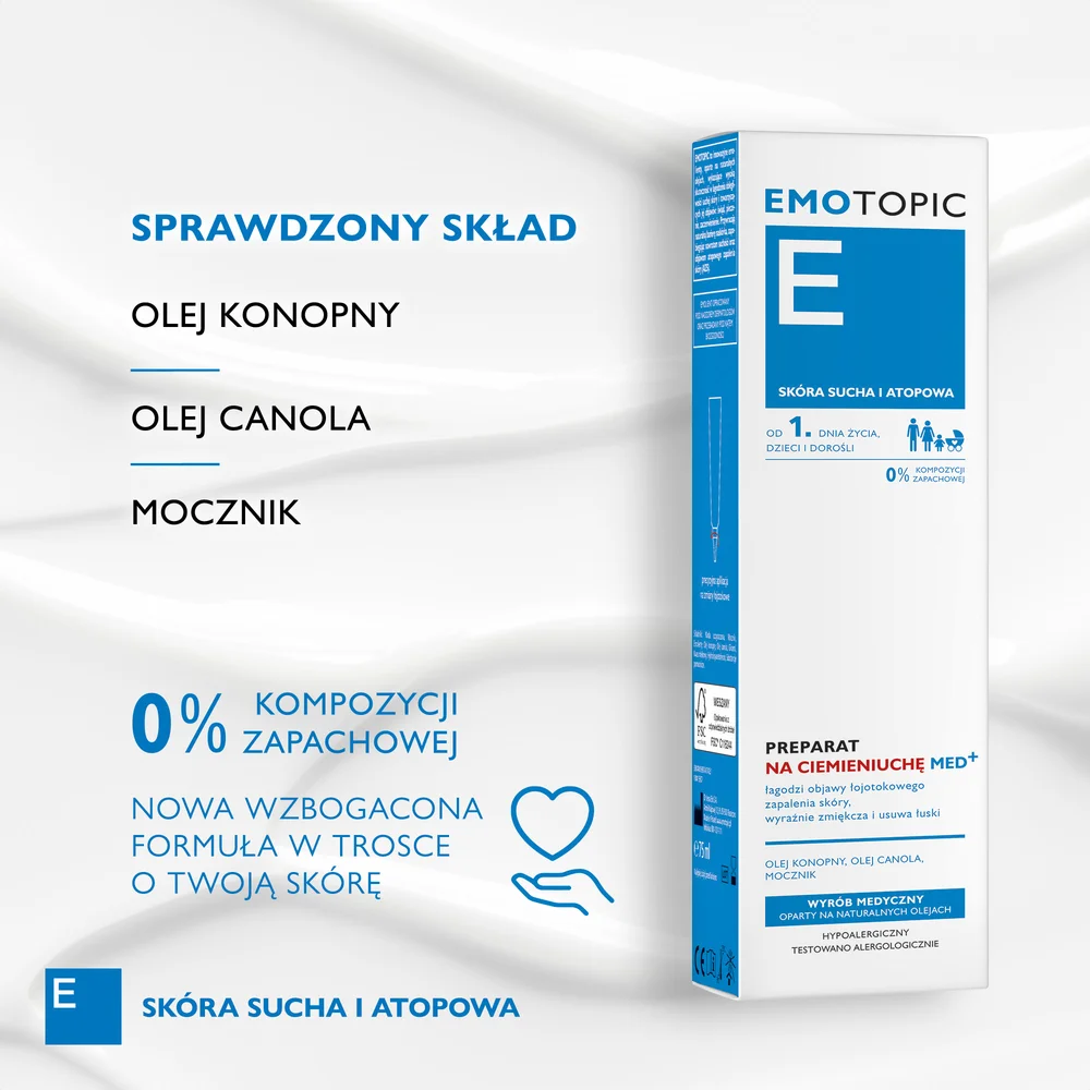 Pharmaceris E Emotopic preparat na ciemieniuchę MED+ – wyrób medyczny przeznaczony do wspomagania leczenia i łagodzenia objawów ciemieniuchy u niemowląt i łojotokowego zapalenia skóry u starszych dzieci oraz osób dorosłych. Formuła produktu opiera się na naturalnych olejach, które pomagają nawilżać i natłuszczać skórę. Wyrób może być stosowany już od 1. dnia życia dziecka.