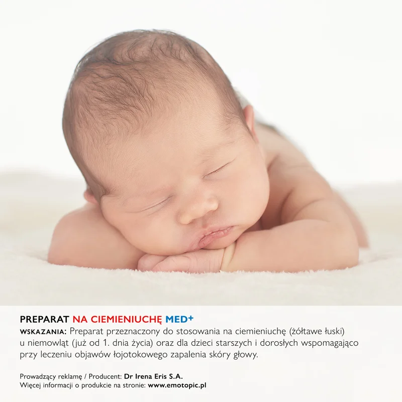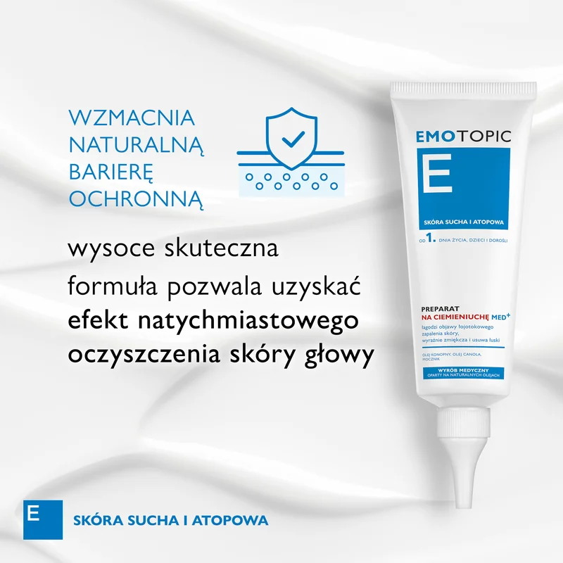 EMOTOPIC PREPARAT NA CIEMIENIUCHĘ MED+ to preparat przeznaczony do stosowania na ciemieniuchę (żółtawe łuski) u niemowląt (już od 1. dnia życia) oraz dla dzieci starszych i dorosłych w celu wspomagania leczenia i łagodzenia objawów łojotokowego zapalenia skóry głowy.Sposób użycia wyrobu medycznego