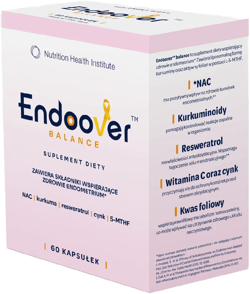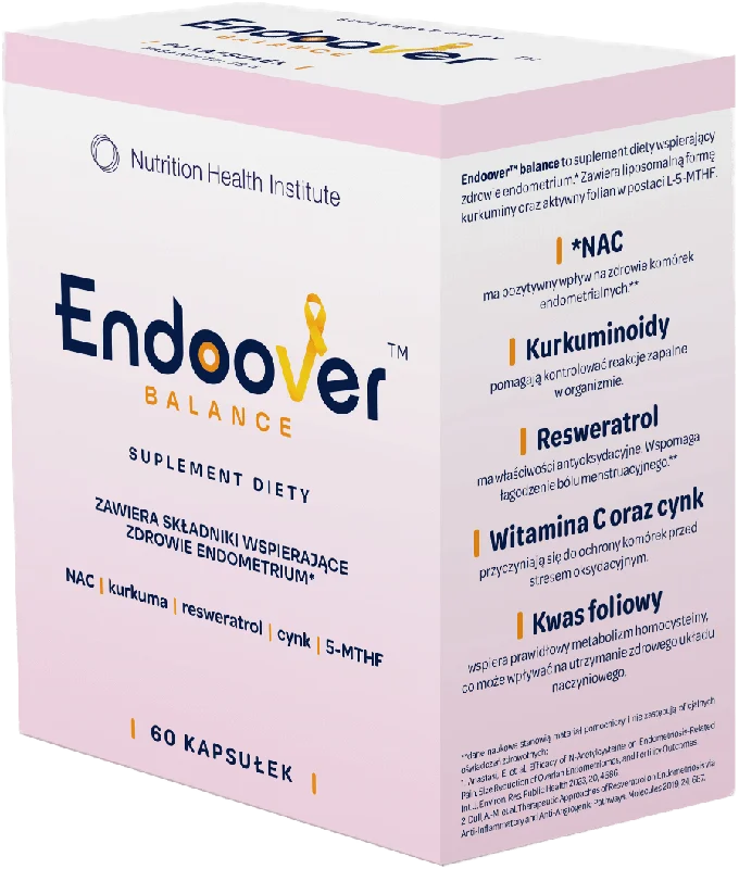 Nutrition Health Institute Endoover Balance to suplement diety w formie kapsułek, zawierający starannie dobrane połączenie kurkuminoidów, resweratrolu oraz N-acetylocysteiny (NAC), które wzajemnie się uzupełniają. Produkt został stworzony z myślą o dorosłych kobietach jako wsparcie i uzupełnienie codziennej.