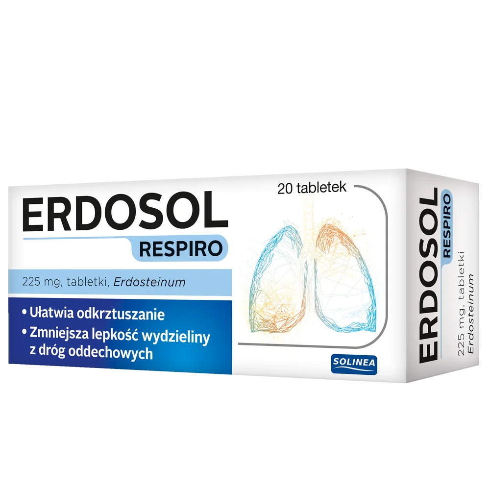 Erdosol Respiro to produkt leczniczy w tabletkach stosowany w leczeniu schorzeń dróg oddechowych przebiegających z gęstą wydzieliną. Produkt dla osób dorosłych i dzieci powyżej 12 lat.
