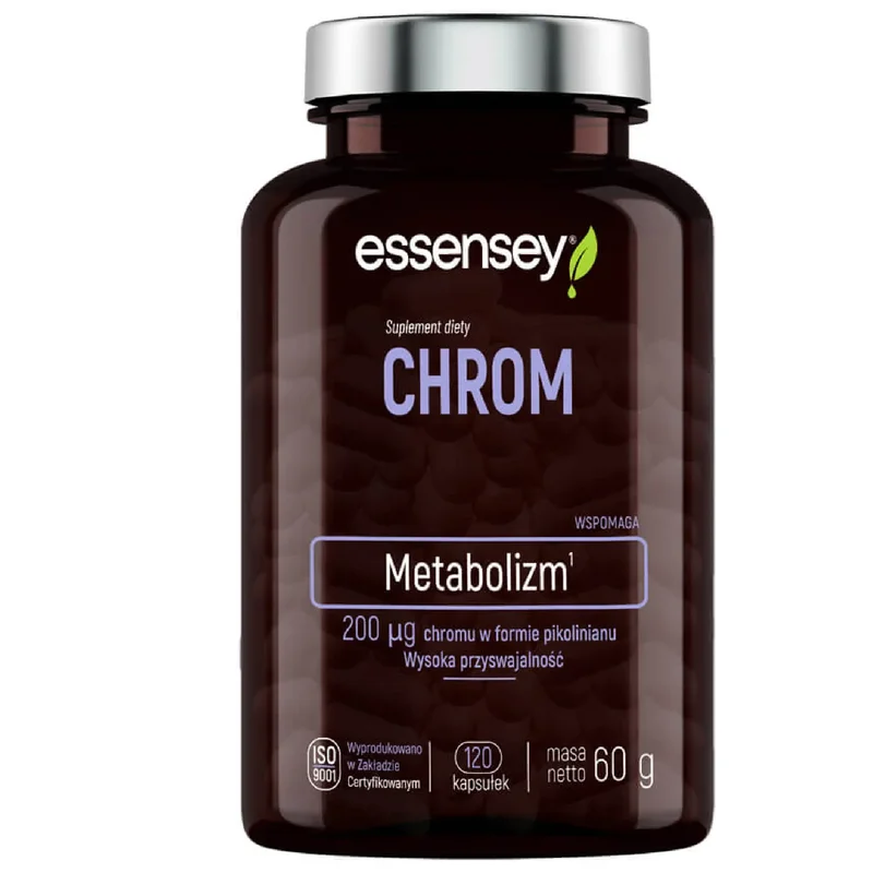 Essensey, Chrom to suplement diety, którego składniki wspierają procesy metaboliczne i regulację poziomu glukozy. Chrom jest pierwiastkiem, który odgrywa rolę w metabolizmie makroskładników oraz w utrzymaniu prawidłowych poziomów cukru we krwi. Suplement ten może być stosowany jako uzupełnienie codziennej diety, w celu zaspokojenia zapotrzebowania na chrom. Produkt odpowiedni dla osób dorosłych.