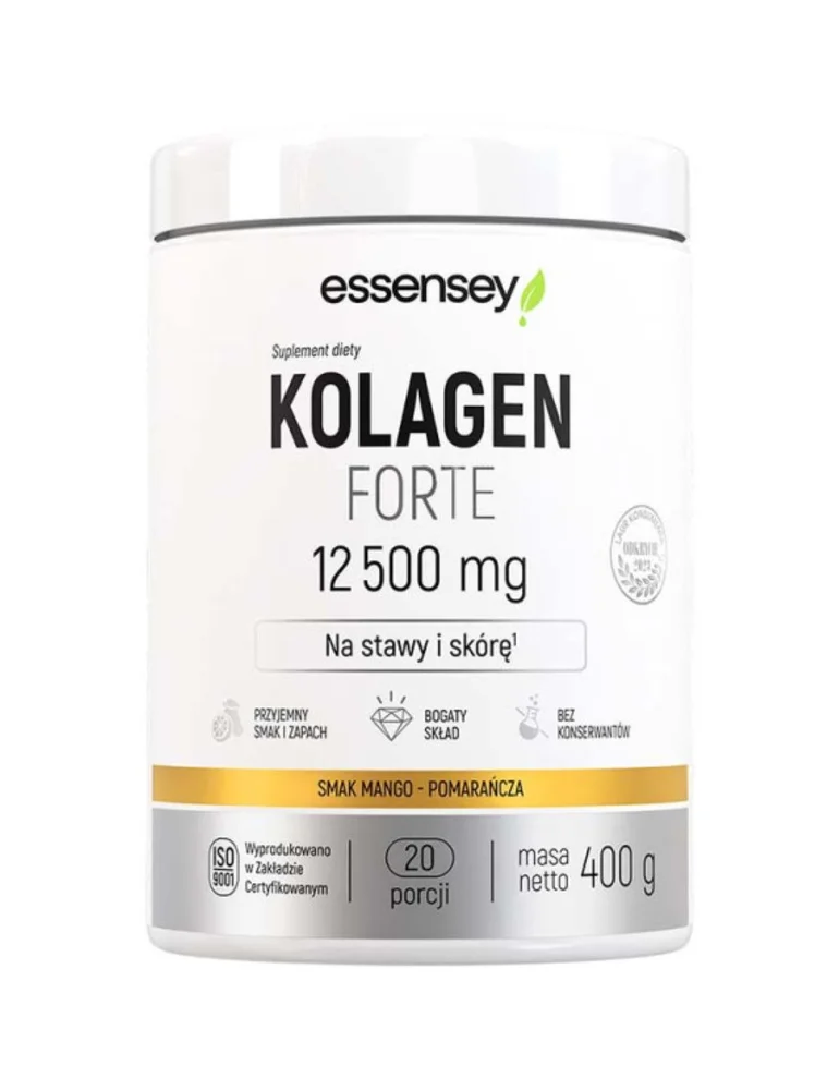 Essensey Kolagen Forte 12500 mg to suplement diety o smaku mango-pomarańcza, którego składniki uzupełniają dietę osób dorosłych w kolagen.