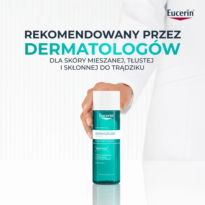 Formuła toniku Eucerin Dermopure Clinical oparta jest na kompleksie dermo-kwasów w stężeniu 2%, łączącym kwasy AHA i PHA: