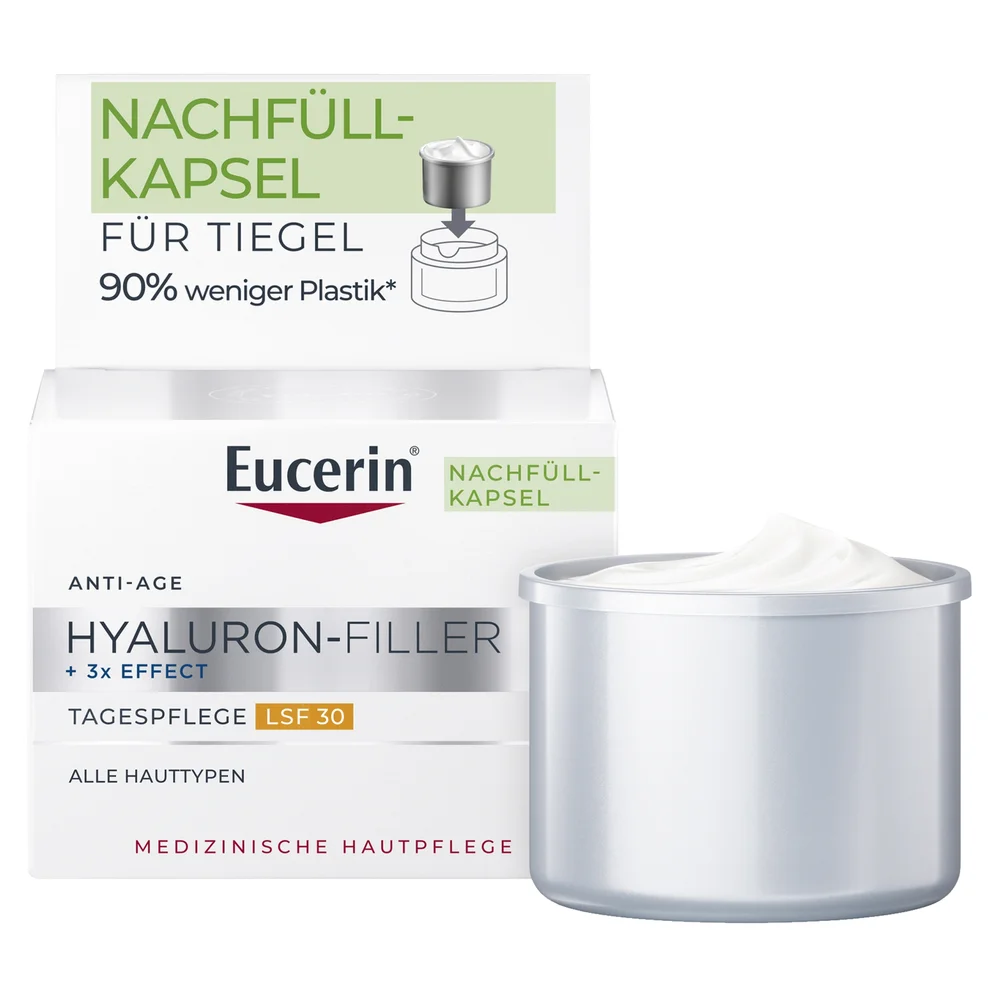 Produkt dostępny w formie wkładu uzupełniającego. Wkład zużywa aż o 90% mniej plastiku niż tradycyjny słoiczek kremu do twarzy Hyaluron-Filler. Jest kompatybilny ze wszystkimi słoiczkami kremów do twarzy Eucerin.