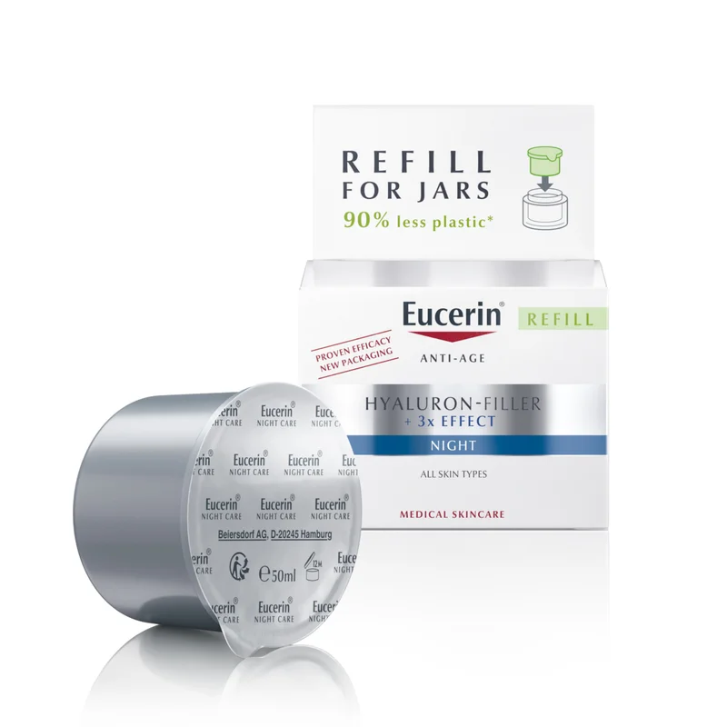Produkt dostępny w formie wkładu uzupełniającego. Wkład zużywa aż o 90% mniej plastiku niż tradycyjny słoiczek kremu do twarzy Hyaluron-Filler. Jest kompatybilny ze wszystkimi słoiczkami kremów do twarzy Eucerin.