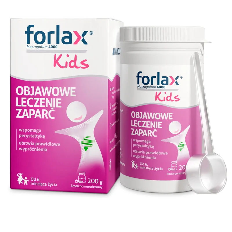 Forlax Kids to wyrób medyczny przeznaczony do objawowego postępowania przy zaparciach u dzieci i dorosłych. Formuła oparta na makrogolu 4000 wspomaga nawodnienie i zmiękczenie stolca, co ułatwia jego wydalanie i wspiera prawidłową perystaltykę jelit. Produkt może być stosowany już od 6. miesiąca życia i działa łagodnie, bezpiecznie oraz przewidywalnie, a jego efekt najczęściej pojawia się w ciągu 1–3 dni.