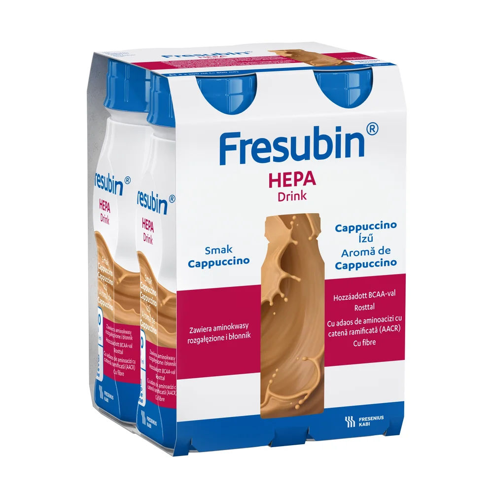 Fresubin Hepa Drink o smaku cappuccino to środek spożywczy specjalnego przeznaczenia żywieniowego, który jest wysokoenergetyczny i bogaty w aminokwasy rozgałęzione (BCAA). Odpowiedni dla osób z przewlekłymi zaburzeniami czynności wątroby lub z jej niewydolnością.Właściwości produktu