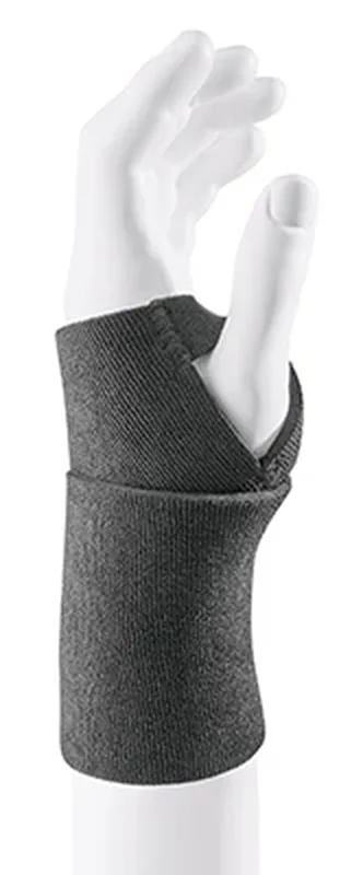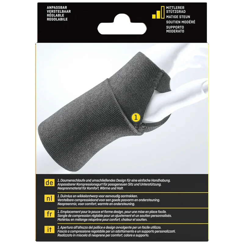 Kciuki włożyć w otwór opaski, skierowanej gładką stroną do wewnątrz. Opaskę przeciągnąć pod spód nadgarstka, a następnie ponownie na wierzch dłoni. Zapięcie zamknąć tak, aby produkt przylegał ściśle, nie powodując dyskomfortu. Przed zastosowaniem produktu należy dokładnie zapoznać się z ulotką/instrukcją dołączoną do wyrobu.Zawartość opakowania