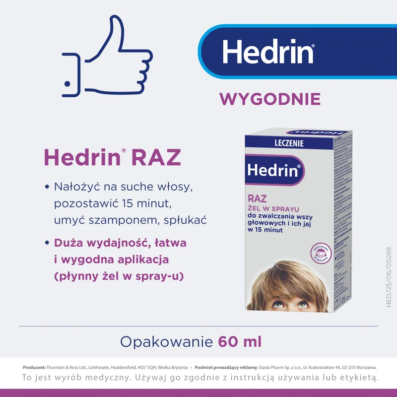 Hedrin Raz żel, spray to wyrób medyczny do zwalczania wszy głowowych i ich jaj w 15 minut.