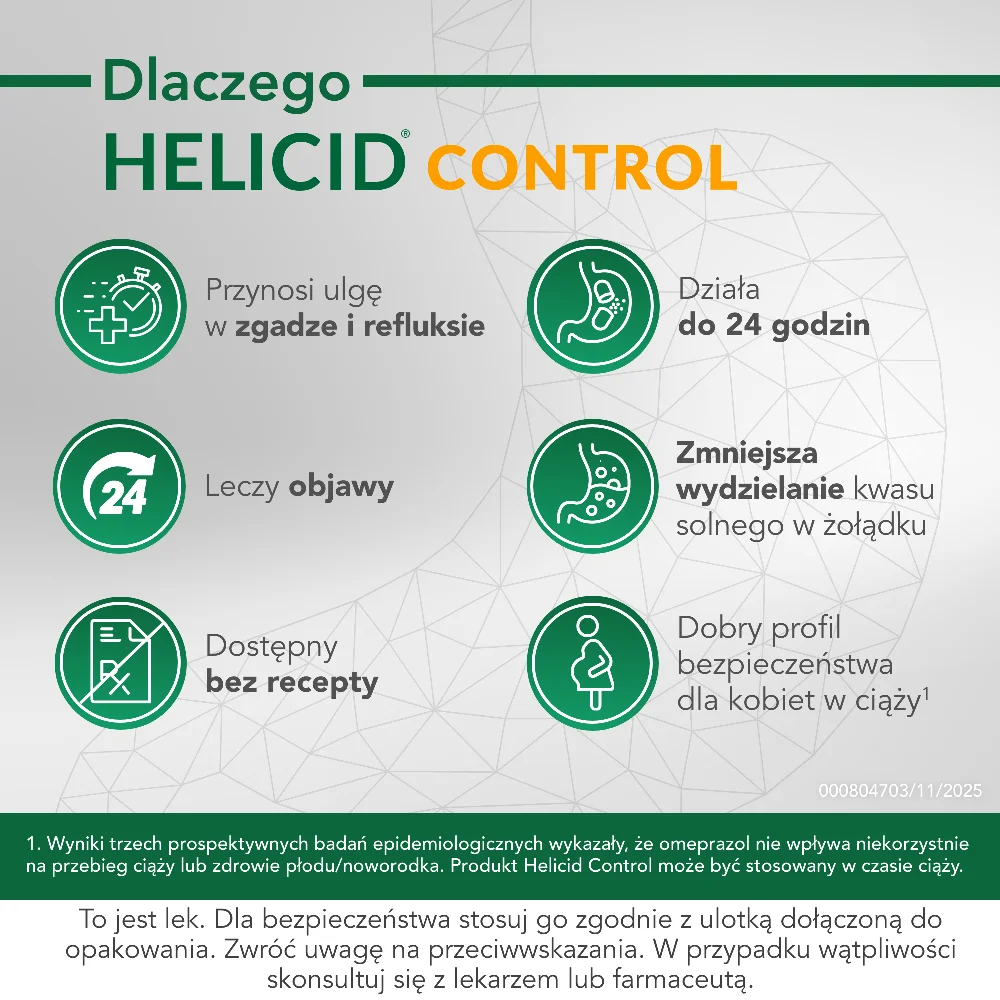 Jak każdy lek, lek ten może powodować działania niepożądane, chociaż nie u każdego one wystąpią. W przypadku zauważenia któregokolwiek spośród poniższych, rzadkich, lecz poważnych działań niepożądanych, należy zaprzestać przyjmowania leku Helicid Control oraz niezwłocznie skontaktować się z lekarzem:• Nagłe wystąpienie świszczącego oddechu, obrzęku warg, języka i gardła lub ciała, wysypka, omdlenie lub utrudnienie przełykania (ciężka reakcja alergiczna).• Zaczerwienienie skóry z powstawaniem pęcherzy lub złuszczaniem. Możliwe jest także powstawanie dużych pęcherzy i występowanie krwawienia w okolicy warg, oczu, ust, nosa i narządów płciowych. Może to być zespół Stevensa-Johnsona lub toksyczna rozpływna martwica naskórka.• Rozległa wysypka, wysoka temperatura ciała i powiększone węzły chłonne (zespół DRESS lub zespół nadwrażliwości na leki).• Czerwona, łuskowata, rozległa wysypka z guzkami pod skórą i pęcherzami, której towarzyszy gorączka. Objawy pojawiają się zwykle na początku leczenia (ostra uogólniona osutka krostkowa).• Zażółcenie skóry, ciemny mocz oraz zmęczenie, które mogą być objawami chorób wątroby. Do innych działań niepożądanych należą:Często występujące działania niepożądane (mogą wystąpić u 1 do 10 na 100 pacjentów):• Ból głowy• Wpływ na żołądek lub jelita: biegunka, ból żołądka, zaparcia, gazy (wzdęcia), łagodne polipy żołądka• Nudności lub wymioty Niezbyt często występujące działania niepożądane (mogą wystąpić u 1 do 10 na 1000 pacjentów):• Obrzęk stóp i kostek• Zaburzenia snu (bezsenność)• Zawroty głowy, uczucie mrowienia i kłucia, uczucie senności• Uczucie wirowania (zawroty głowy [zaburzenia równowagi])• Zmiany w wynikach badań czynnościowych wątroby• Wysypka skórna, wysypka grudkowata (pokrzywka) oraz świąd skóry• Ogólne złe samopoczucie oraz brak energii Rzadko występujące działania niepożądane (mogą wystąpić u 1 do 10 na 10 000 pacjentów):• Problemy dotyczące krwi, takie jak zmniejszona liczba krwinek białych lub płytek krwi. Może to prowadzić do osłabienia, łatwiejszego powstawania siniaków lub zwiększenia prawdopodobieństwa wystąpienia zakażenia• Reakcje alergiczne, niekiedy bardzo ciężkie, obejmujące obrzęk warg, języka i gardła, gorączkę, świszczący oddech• Małe stężenie sodu we krwi. Może to prowadzić do osłabienia, wymiotów i kurczów mięśniowych• Uczucie pobudzenia, splątania lub przygnębienia• Zmiana odczuwania smaku• Problemy ze wzrokiem, takie jak niewyraźne widzenie• Nagłe wystąpienie świszczącego oddechu lub duszności (skurcz oskrzeli)• Suchość w jamie ustnej• Zapalenie błony śluzowej jamy ustnej• Zapalenie jelita (prowadzące do biegunki)• Zakażenie określane mianem „grzybicy”, które może obejmować jelita i jest wywołane przez grzyby• Zaburzenia dotyczące wątroby, w tym żółtaczka, które mogą powodować zażółcenie skóry, ciemne zabarwienie moczu oraz zmęczenie• Wypadanie włosów (łysienie)• Wysypka skórna podczas ekspozycji na słońce• Bóle stawów (artralgia) lub bóle mięśni (mialgia)• Ciężkie zaburzenia dotyczące nerek (śródmiąższowe zapalenie nerek)• Zwiększona potliwość Bardzo rzadko występujące działania niepożądane (mogą wystąpić u mniej niż 1 na 10 000 pacjentów):• Zmiany w morfologii krwi włącznie z agranulocytozą (brakiem białych krwinek)• Agresja• Widzenie, odczuwanie lub słyszenie rzeczy nieistniejących (omamy)• Ciężkie zaburzenia dotyczące wątroby prowadzące do niewydolności wątroby i zapalenia mózgu• Nagły początek ciężkiej wysypki lub powstawania pęcherzy na skórze lub złuszczania skóry. Mogą temu towarzyszyć wysoka gorączka oraz bóle stawów (rumień wielopostaciowy, zespół Stevensa-Johnsona, toksyczna rozpływna martwica naskórka)• Osłabienie mięśni• Powiększenie piersi u mężczyzn Działania niepożądane występujące z częstością nieznaną (częstość nie może być określona na podstawie dostępnych danych):• Hipomagnezemia.• Wysypka mogąca przebiegać z bólem stawów.Ostrzeżenia i środki ostrożności