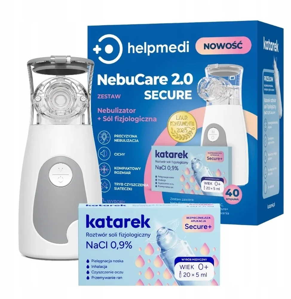 HelpMedi NebuCare 2.0 Secure zestaw nebulizator + sól fizjologiczna, 1 zestaw