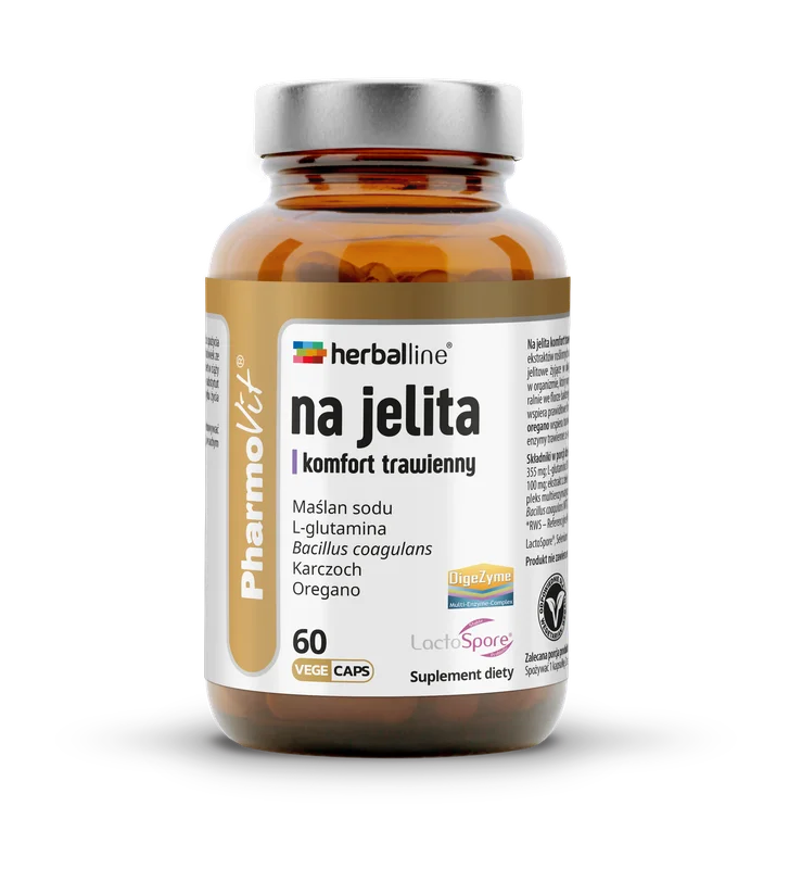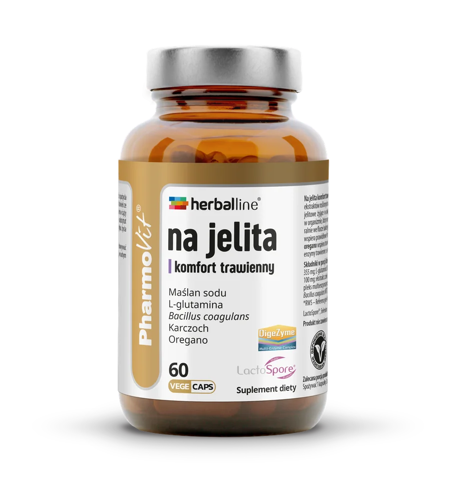 Herbaline Na jelita komfort trawienny to suplement diety, którego składniki wspierają prawidłowe funkcjonowanie układu pokarmowego oraz przyczyniają się do utrzymania komfortu trawiennego. Zawarte w preparacie substancje pomagają w regulacji procesów trawiennych i wspomagają utrzymanie równowagi mikroflory jelitowej. Suplement ten stanowi wsparcie dla organizmu w codziennym funkcjonowaniu układu pokarmowego. Produkt odpowiedni dla osób dorosłych.