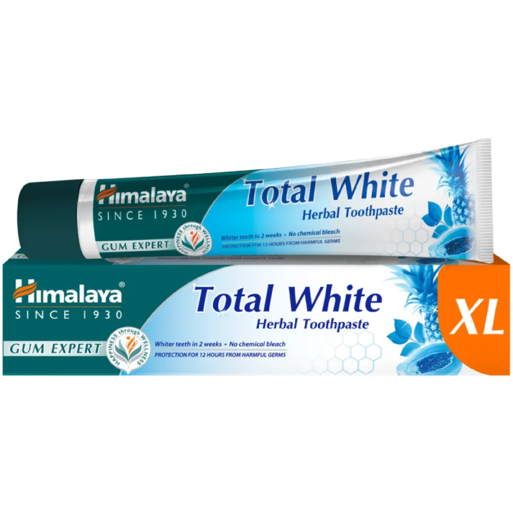 Himalaya, Total White Herbal XL to produkt kosmetyczny, który zawiera naturalne składniki. Został stworzony z myślą o wybielaniu zębów oraz świeżym oddechu. Formuła pasty wspomaga usuwanie przebarwień i pomaga w utrzymaniu zdrowia jamy ustnej. Produkt jest przeznaczony do codziennego stosowania i zawiera zioła, które wspierają higienę zębów i dziąseł. Produkt odpowiedni dla osób dorosłych oraz dzieci powyżej 7. roku życia.