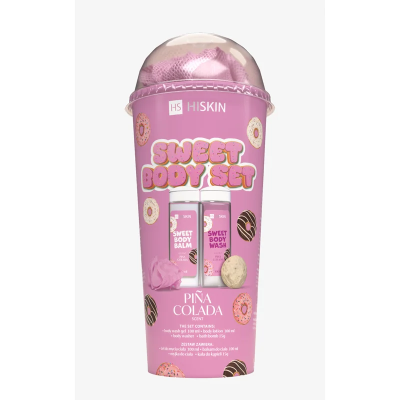 Hiskin Sweet Body Set zestaw o zapachu Pina Colady: żel pod prysznic 100 ml, balsam do ciała 100 ml, myjka 1 sztuka, mini kula do kąpieli 15 g