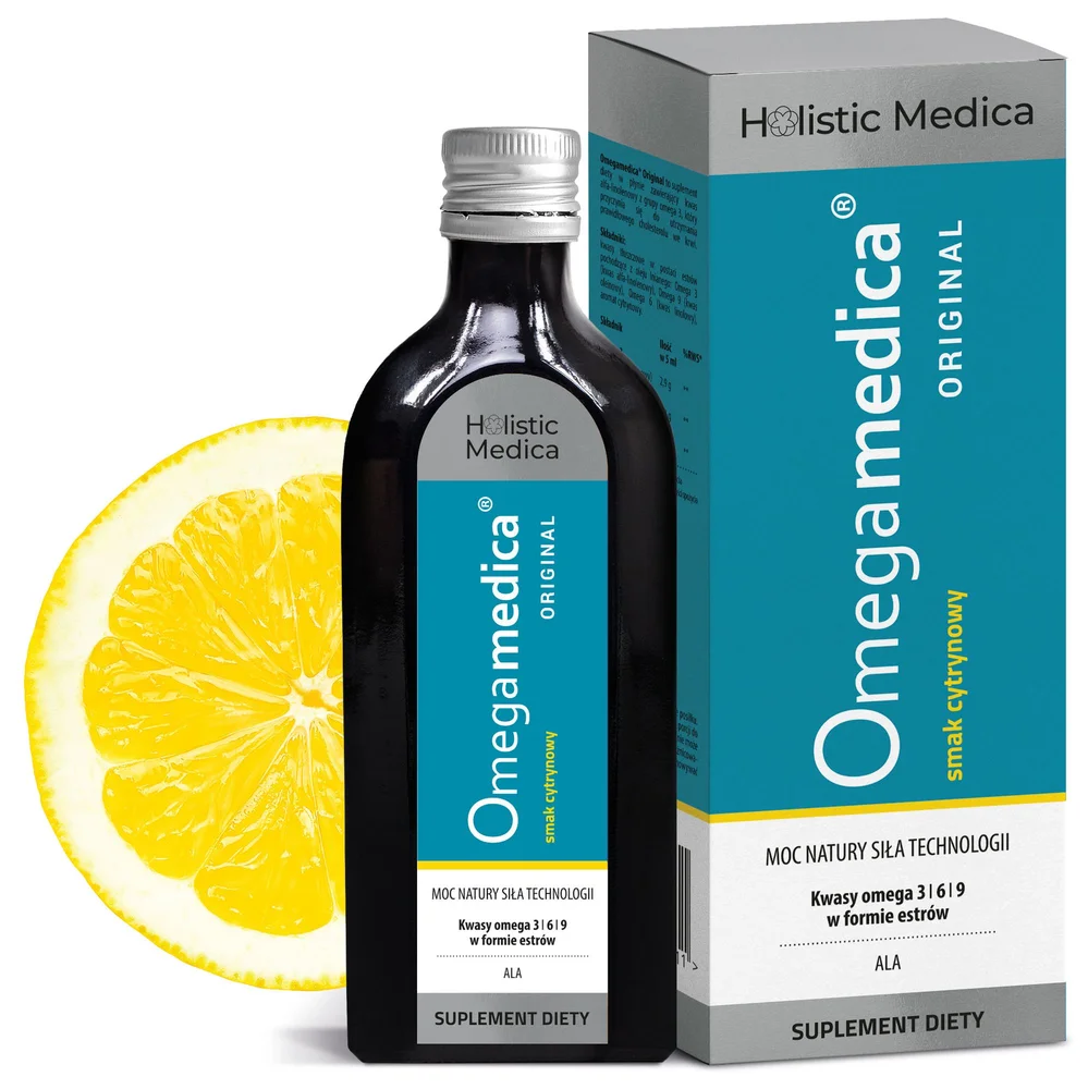 Omegamedica Original - suplement diety o smaku cytrynowym zawierający zestaw najczystszych kwasów omega 3, 6, 9 pozbawionych niezdrowych substancji, które występują w oleju lnianym i oleju rybim. Produkt przeznaczony dla dorosłych.