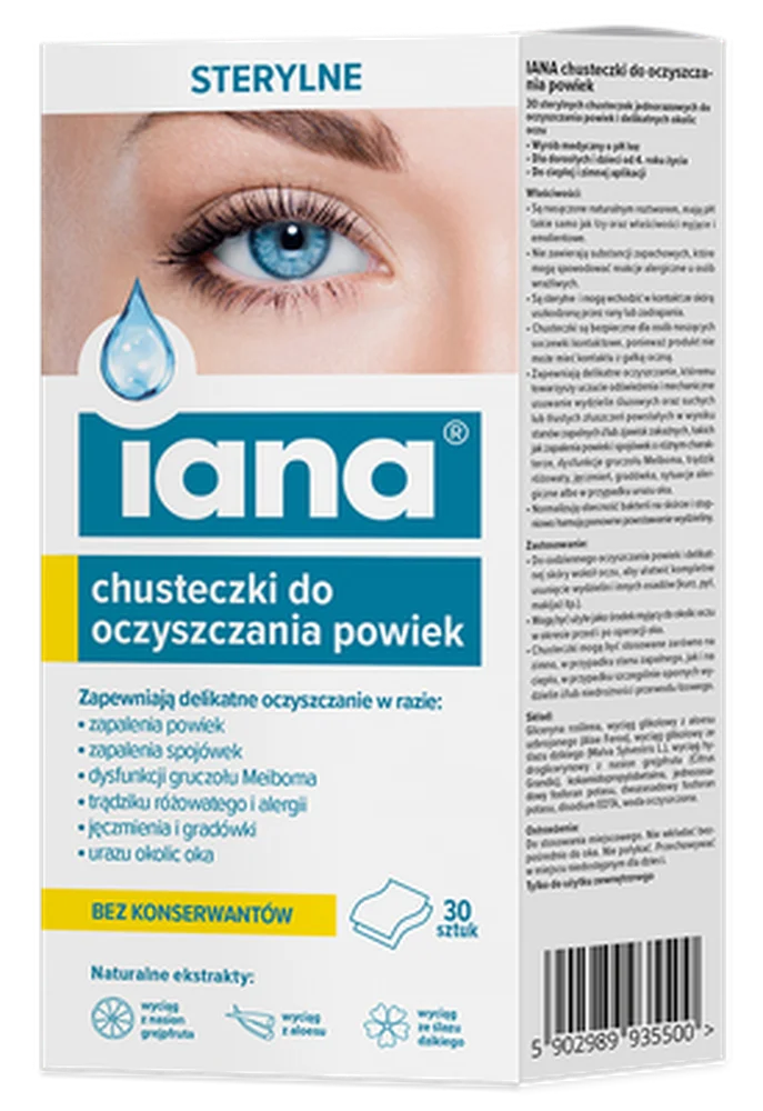 IANA chusteczki do oczyszczania powiek to wyrób medyczny przeznaczony do delikatnej pielęgnacji skóry powiek i rzęs. Produkt skutecznie usuwa zanieczyszczenia oraz wspiera utrzymanie higieny i komfortu wrażliwej okolicy oczu.