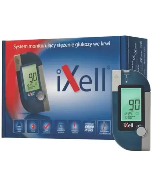 Zawartość opakowania: glukometr iXell®, płyn kontrolny Glucosense®/iXell®, nakłuwacz Glucosense®/iXell®, 10 sterylnych lancetów Glucosense®/iXell®, nakładka do badań AST, 10 szt. pasków testowych iXell®, bateria CR 2032 3V, instrukcja obsługi, karta gwarancyjna, etui.