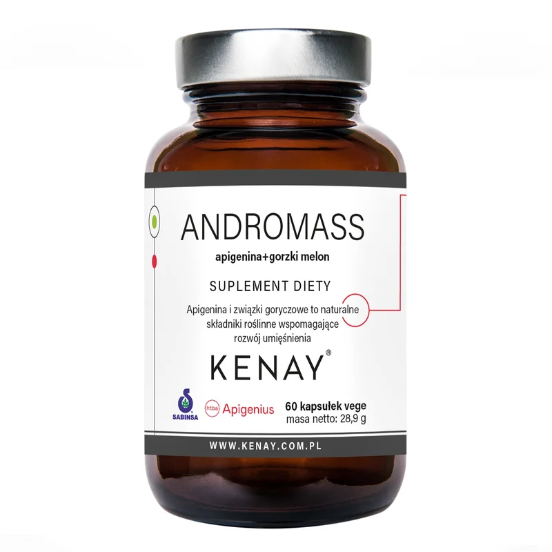 Kenay, AndroMass Apigenina + Gorzki melon to suplement diety, w którego składzie znajdziesz apigeninę pozyskiwaną z owoców grejpfruta oraz ekstrakt z owoców gorzkiego melona. Produkt opracowany dla osób dorosłych.