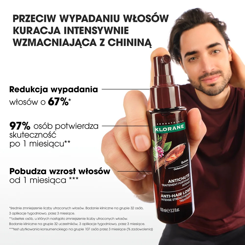 Klorane Przeciw Wypadaniu Włosów, Kuracja intensywnie wzmacniająca z chininą to produkt kosmetyczny w postaci serum opracowane z myślą o pielęgnacji włosów osłabionych, z tendencją do wypadania. Wspomaga ich wzmocnienie oraz stymuluje naturalny wzrost.