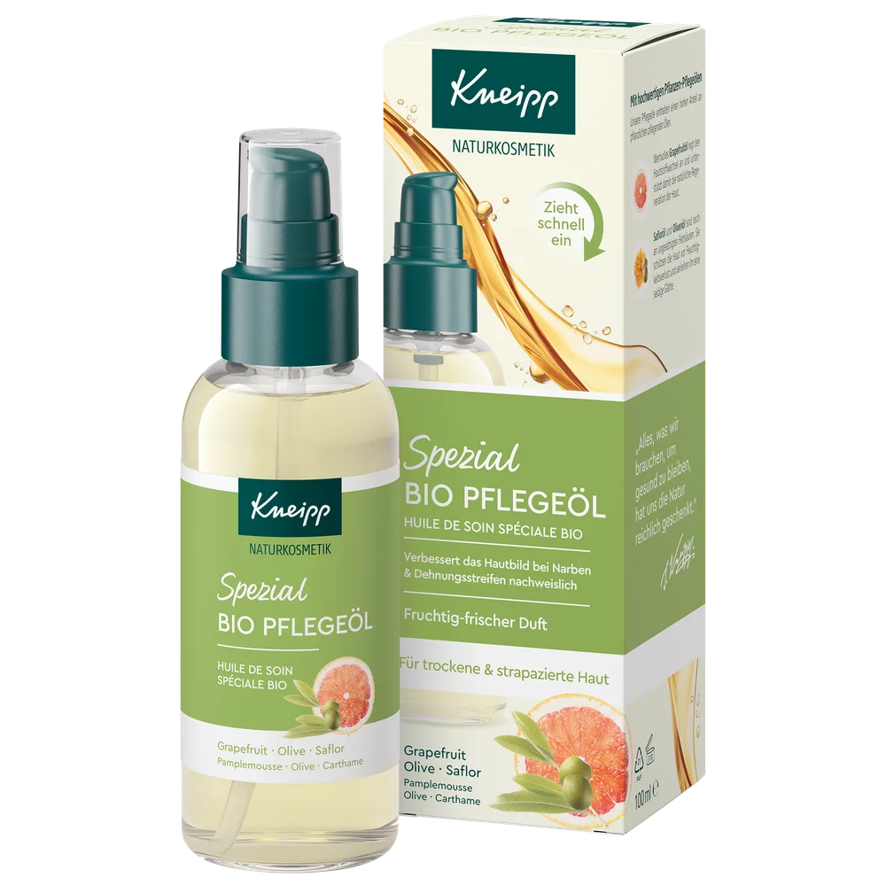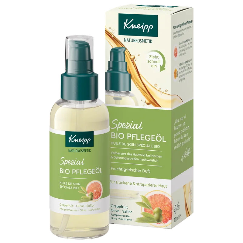 Kneipp, Specjalny pielęgnacyjny BIO-Olejek do ciała to produkt kosmetyczny. Zawiera naturalne składniki, które pielęgnują skórę i przyczyniają się do jej nawilżenia. Olejek przeznaczony jest do codziennej pielęgnacji, zapewniając uczucie miękkości i gładkości. Dzięki praktycznej pompce aplikacja jest wygodna. Produkt nie zawiera parabenów ani silikonów, co sprawia, że jest odpowiedni dla osób dbających o naturalną pielęgnację.Składniki/Ingredients